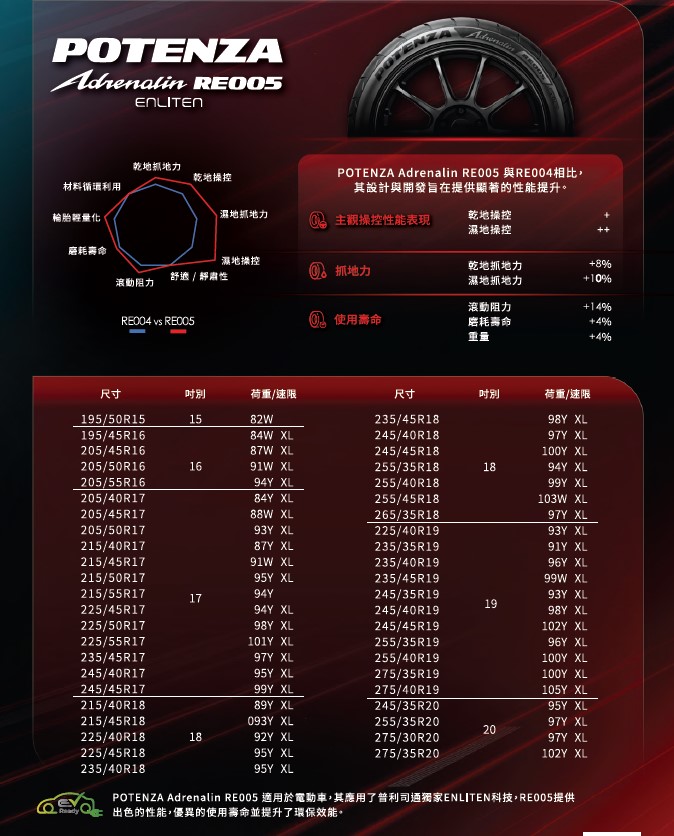 POTENZA Adrenalin RE005搭載了全新胎面膠料,該橡膠配方同時優化了滾動阻力,提升能源效率並延長輪胎壽命。此外,多重圓弧花紋塊(Multi-Round Block)設計能平衡胎肩接地的壓力分布,使胎面磨耗更均勻,完美兼顧耐用度與動態表現。RE005 也同步導入創新 ENLITEN 技術,透過專屬輕量化材料與先進製程,有效降低滾動阻力並提升耐磨表現,不僅大幅降低能源消耗,也有助於延長電車續航里程,滿足新世代電動車駕駛對效率與駕馭樂趣的雙重需求。 ![]() 滿足多元車型,釋放駕馭樂趣