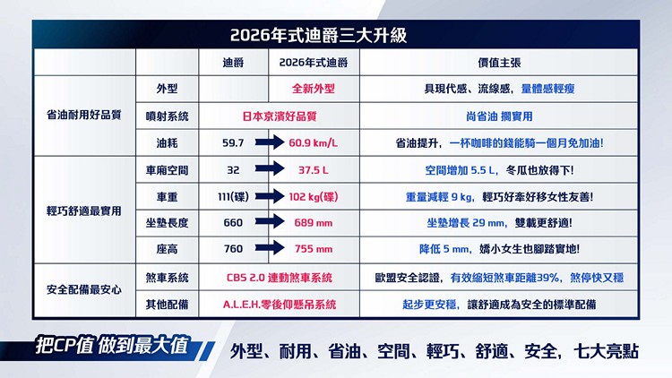 三、【省油升級】省油提升59.7km/L→60.9km/L,油箱變大5.5L→6.5L,「續航里程提升20%」。依交通部調查台灣機車族每月通勤里程 279.3 公里試算,油資僅約 NT$133 元,尚省油擱實用,實現「一杯咖啡的錢能騎一個月免加油」的經濟效益。 四、【空間升級】 加大5.5L達37.5L 超大車廂空間更深更寬,可同時放入兩頂 3/4 安全帽、雨衣及包包外,大冬瓜也放得下!260mm 寬敞前置腳空間與可容納 700cc 飲品的前置物空間。 ![]() ▲37.5L 大置物空間,放入兩頂 3/4 安全帽綽綽有餘![]() ▲就算是 700cc 大杯手搖飲 甚至冰霸杯都能立正放好![]() ▲260mm 前置腳空間五、【輕巧升級】車重減輕 9 公斤,透過輕量化工程,車重從 111kg 降至僅 102kg。搭配省力中柱設計,讓女性使用者也能在窄小巷弄中輕鬆牽行與駐車 。 ![]() ▲755mm 超低座高,小個子女生也能腳踏實地六、【舒適升級】同級最長坐墊與低座高,坐墊長度增加 29mm,達到 689mm 同級最長,確保雙載舒適不擁擠;座高同步降低至 755mm,讓身材較嬌小的騎士也能腳踏實地,提升上下車的便利性。 ![]() ▲689mm 同級最長坐墊更加寬大平整、 Q 彈材質久坐不累,搭配獨家零後仰技術更加舒適七、【安全升級】標配 SYM 獨家 CBS2.0 連動煞車系統,獲得歐盟安全認證,相較傳統系統可縮短煞車距離達 39%,讓煞停更快、更穩。配合 A.L.E.H. 零後仰懸吊技術,起步更平穩安全。 ![]() ![]() ![]()