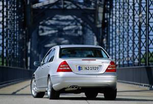 ![]() ▲從車尾望去,可以發現C32 AMG搭載了AMG版的雙橢圓造型尾管。在新車系上市一段時間後再推出該車系的原廠高性能車款,已經是MERCEDES-BENZ的一個慣例了,但是DAIMLER-CHRYSLER(以下簡稱DCX)在最近全新發表、以新一代C-Class(W203)為基礎所開發出的高性能AMG版本車型,卻仍然帶給大家極大的意外與震撼。最早可以回溯到1994年時,以上一代車型(W202)為基礎所發展出的C36 AMG,一直到其後大受好評的八缸車款C43 AMG與C55 AMG,MERCEDES-AMG GmbH總共製造了接近9000輛的C-Class高性能版本車型。應該是為了呼應車廠近年來全力開發增壓引擎的作法,這次登場的C32 AMG一改以往AMG車系慣用擴大汽缸容積或直接改用大排氣量引擎的作法,使用原本C320車款上的那具3.2升V-6引擎作為動力來源,但在加裝了一具EATON出品的機械增壓裝置後,C32 AMG的動力一舉跳升到幾乎與C55 AMG同級的354hp水準,更別說那驚人的扭力輸出與超低的油耗(考量到其動力水準)與污染表現。憑藉著C32 AMG超越同級車的性能表現與新C原本就大受好評的操控表現,車廠方面預期新車款將會有超越前代車款的銷售表現,而達到每年3500輛的預期數量。