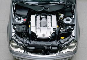![]() ▲除了驚人的352hp動力輸出外,光是這具3.2升的機械增壓V-6引擎本身的造型就已是一種工業藝術品。與C320同樣的,由於DCX一直致力於開發更高性能的自排車種,新一代的C-Class雖然新增添了六速手排變速系統,但是頂級車型反而都是採清一色五速自排變速箱的配置,而這點縱使在C32 AMG上也不例外。不過稍稍與C320不同的是,為了配合C32 AMG大幅提昇的動力表現與車款的運動化取向,該車款的自排變速箱在換檔點的設定等方面特地還由AMG的工程師們親自操刀設定過。透過這具變速箱將動力傳遞到後輪,C32 AMG可以在5.2秒內由靜止加速到100km/h,而極速則由電子裝置限制在250km/h的水準。當然,既然是掛上AMG的名號,C32 AMG的底盤部分也經過進一步的運動化調校,其中主要的改變點包括重新設定的彈簧/阻尼值,車高降低30mm,搭載尺寸與C320選用的AMG版底盤套件相同、但是造型卻截然不同的前後17吋合金輪圈,以及前225/45R17、後245/40R17尺碼的PIRELLI新一代頂級輪胎、P-Zero Rosso。為了提供能夠與強大動力批敵的制動性,C32 AMG原廠搭載了AMG最近新開發的改良煞車系統,其前輪部分採用345×30mm的打孔通風碟,而後輪則是300×22尺碼的內通風碟,而除了原本在機械面上就非常優異的表現外,透過ABS、ESP、ASR與BAS等電子穩定裝置,讓C32 AMG除了擁有跑得快的能力外,也有停得下來的本錢。