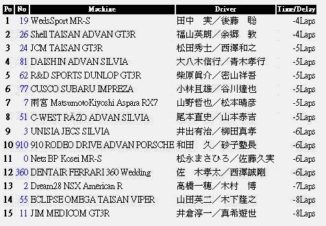 在WedsSport MR-S的後方,26號Shell TAISAN ADVAN GT3R、81號DAISHIN ADVAN SILVIA、71號SIGMA MR-S、3號UNISIA JECS SILVIA、31號ARTA A'PEX MR-S等車在領先集團展開一陣激烈廝鬥,其中UNISIA JECS SILVIA與ARTA A'PEX MR-S兩車發生擦撞意外,ARTA A'PEX MR-S甚至連引擎蓋都被掀開,並將前擋割破,慘遭退賽結果;SIGMA MR-S也在後來因為機械問題,加入了退賽的行列。