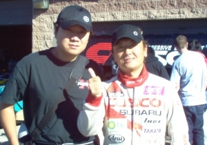 ▲相見歡留念,小林(右)下次帶你逛L.A.首都高一旁等候的小林,正將一批批試乘者載回Pit,可以想像那些乘客此時感受,稍事休息筆者跳上小林的「硬皮鯊」接受蹂躪,大腳油門四驅穩穩地將車子拋入跑道,比較起RX7幾近真空狀態般的FR旅程,筆者覺得四輪驅動較具親和力,進出彎的動態均趨向平穩,幸而這是輛市售車,否則JGTC版的FR硬皮鯊力道,應該會更讓人魂飛魄散,小林邊呸車開始跟我邊聊天,從車子聊到佐藤琢磨又帶到美食、我的日本老婆和台灣之旅,只見車子越呸越快,他卻是一路談笑風生,還能察覺後後輪抓力問題,這種一心多用真是職業級水準。下車後,聽到一旁的老美喊著:「日本車為何那麼快!?」,我還在偷笑著他們至今仍接受不了日本科技進步的事實,想著手上拿的相機、手機,家中的電視、音響,日本的技術早就凌駕眾多國家,包括號稱第一強權的美國,相信此番也讓老美開了眼界。