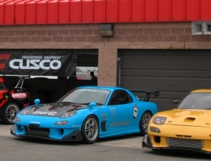 ![]() ▲井入宏之不愧是JGTC好手群之一,抓了方向盤就殺。話說回來!日本廠商嗅到北美濃郁的市場潛力,近年來積極轉移重心至此,車手、賽車皇后、技師群頻頻叩關,擔任CUSCO、RE雨宮車隊的兩位職業車手,就特別來此獻技。由於JGTC車輛仍在日本調校參賽,因此廠商方面調借的是美國分部的展示車,即全車彩繪的一般車種,只不過因應場地和車手,輪胎、懸吊都換成競技規格。CUSCO端上的是一輛Impreza WRX STi,RE雨宮車隊則是提神飲料「阿斯巴拉」彩繪的RX7,全車藍色相當顯眼。