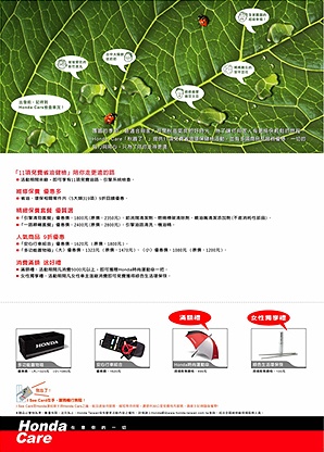 活動期間Honda Taiwan還推出了人氣商品組合,一直深受車主的喜愛的「安心行車組合」及「多功能置物箱」均可享有9折的優惠。活動期間凡消費滿5000元以上,更可獲贈Honda時尚運動傘一把的滿額好禮;針對女性車主,還推出女性獨享禮,凡活動期間回廠的女姓車主,即可免費獲得綠色生活環保筷。