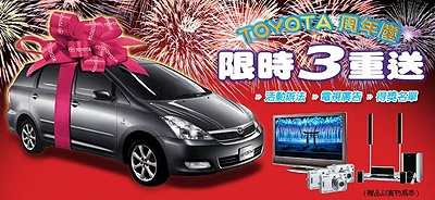 「TOYOTA周年慶天天有好視3重送」活動自95年10月1日起至31日止,消費者到TOYOTA全省各地經銷據點賞車,並填妥個人資料,即可參加抽獎。第1重,針對買車顧客提供0利率大放送,包括CAMRY、WISH 、ALTIS、VIOS、PREVIA,分別提供各項購車優惠專案,讓顧客輕鬆入主TOYOTA熱賣車種。第2重,顧客來場賞車,有機會抽中超人氣的WISH 2.0 E車一部(參考市價:75.8萬元)。第3重,訂車天天抽Sony液晶電視、家庭劇院及數位相機,採累計抽獎,每天抽出40名得獎者,獎額多中獎容易,愈早訂車中獎機會愈多。
