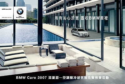 ![]() 汎德公司始終以專業先進的技術與關懷車主的熱忱,提供所有BMW車主最優質的售後服務。延續 BMW Care全方位服務車主的精神,今年汎德公司將於5月16日起於全省同步展開BMW Care涼夏節—空調暨冷卻系統免費檢查活動,誠心地邀約所有BMW車主,回廠為愛車做妥善檢查,同時體驗車主獨享權益與各項優惠。BMW空調暨冷卻系統檢查活動,均由經驗豐富的維修技師運用BMW原廠DIS診斷電腦,以最精密的調校、最專業的多項維修服務及優惠,讓您的愛車常保如新。