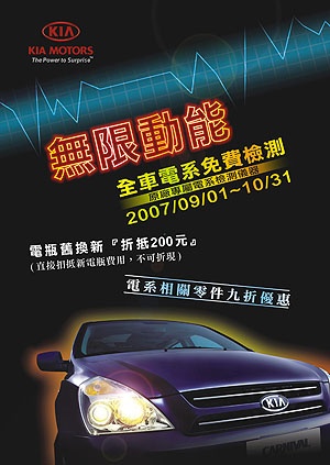 KIA總代理太古運通汽車自9月1日起至10月31日止,舉辦為期二個月的「無限動能」-全車電系免費檢測服務活動。KIA汽車服務廠全面引進電導電力測試儀器,可精確檢測車輛充電系統的健康情形,以避免愛車處於無電啟動的窘況。活動期間將為KIA車輛免費全車電系安全檢測,並同時推出電瓶舊換新折抵200元及電系相關零件九折優惠活動。