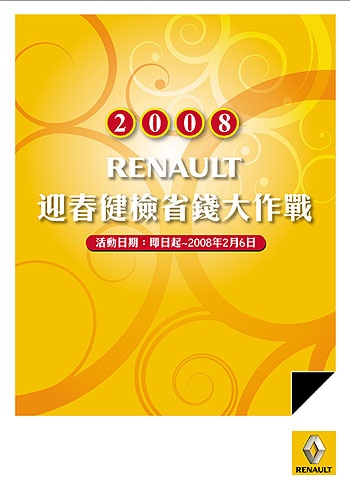 隨著2008年的來臨,RENAULT在台灣已與全國的RENAULT車主共同度過了八個年頭。今年RENAULT還是一樣與所有的車主一起來迎接嶄新的一年。RENAULT提醒車主們,再優良的車輛安全設計,若沒有適時定期的檢測與維護,在行車安全上的保護一定會有所影響,所以愛車一定要進行定期且詳細的安全檢查,以守護全員行車安全。