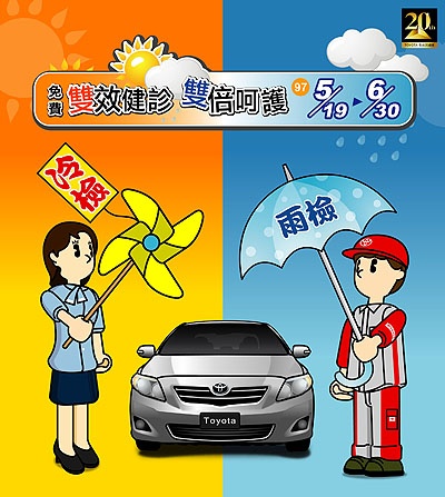 TOYOTA總代理和泰汽車公司,為傳達關懷呵護車主心意,於5月19日起至6月底,舉辦「雙效健診 雙倍呵護」活動,為TOYOTA車主愛車免費健檢。不同於以往,本次健檢回廠除實施炎夏來臨前的「冷氣健檢」外,另外也同步實施愛車在梅雨季來臨前的「雨檢」,透過TOYOTA全台服務廠原廠技師,檢查冷氣相關機件,以及雨刷、全車防水膠條等,「冷檢」、「雨檢」雙管齊下,讓所有TOYOTA車主們一路上清涼無虞,歡度炎夏。
