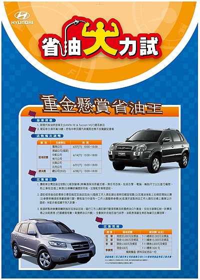 根據三陽現代汽車表示:為了充分展現現代柴油休旅車系在整體燃油經濟性的絕佳表現,本月將逐週於全省六大區域舉行各區初賽,首先第一場是6/7(星期六)在嘉南地區的新營現代汽車展示中心(台南縣730新營市復興路1137號 TEL:06-6522816),活動時間:11:00~18:00;第二場是6/14(星期六)於高屏/中彰/桃竹同步舉行;第三場是6/21(星期六)於台北縣市,歡迎在地民眾屆時可以前往觀摩比較。