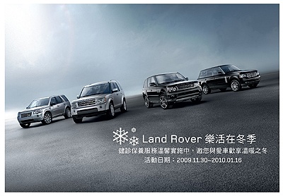 為了關懷車主歲末年終需求與迎接即將到來的2010年,JAGUAR / LAND ROVER台灣總代理九和汽車關心車主愛車健康,確保愛車在寒冬行駛無慮、安心過好年自2009年11月30日起至2010年1月16日止,將舉辦JAGUAR / LAND ROVER歲末健診活動。