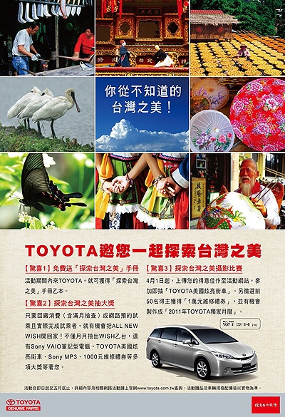 Toyota總代理和泰汽車為回饋國內廣大消費者,自即日起至5月底止,舉辦「探索台灣之美」系列活動。活動包含「探索台灣之美抽大獎」、「探索台灣之美攝影比賽」及免費贈送「探索台灣之美」手冊。活動期間回廠消費的Toyota車主或網路預約試乘的民眾(需完成試乘),還有機會成為Toyota Wish 2.0J的車主 (3名)。