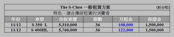 ![]() Mercedes-Benz S-Class一直以來都是大型高級豪華房車的典範,每一代新型車款,無可比擬的外觀建立了未來設計與多樣化豪華配備的標竿,台灣賓士針對 11/12 年式 S 350 BlueEFFICIENCY L 和S 400 HYBRID L 兩款車型,推出「嶄新靈活租賃方案」,提供車主彈性靈活的租賃模式,合約共計三年(36期),客戶可於兩年期滿(24期) 註1時提前結清還車,並選購其他 Mercedes-Benz S-Class 車款,不須另外支付解約金註2,月付$97,500起,即可輕鬆入主賓士豪華旗艦車款 S-Class。