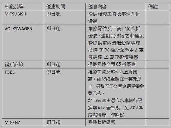 國內各車廠/商針對風災與豪雨受災車輛提供維修優惠彙整