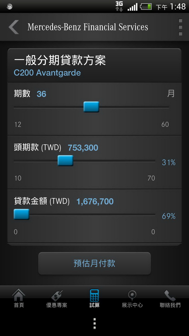 ![]() myMBFS應用程式』為賓士資融亞非區總公司特別研發之手機應用程式 ,其設計概念源自於現代人生活與消費習慣的改變,除了銜接傳統直接前往展示中心賞車的購車模式,更加入運用先進的應用軟體程式,以符合新世代族群會在消費前在網路蒐集購車資訊的習慣,並將其延伸至智慧型手機上,讓消費者可運用「myMBFS」App用手指輕點滑動、即可獲得最適合的購車計畫。