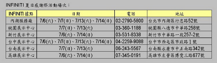 INFINITI台灣區總代理裕隆日產汽車將於2013年7月份舉辦「夏日感謝祭」活動(註1),來店貴賓除可抽INFINITI獨家精品外,活動現場更將提供包括澎湖春仁黑糖糕、連珍芋頭球等8大熱門網購美食,並安排INFINITI BOSE影音劇院體驗、Show Girl攝影、親子3D立體拼圖等同樂活動。