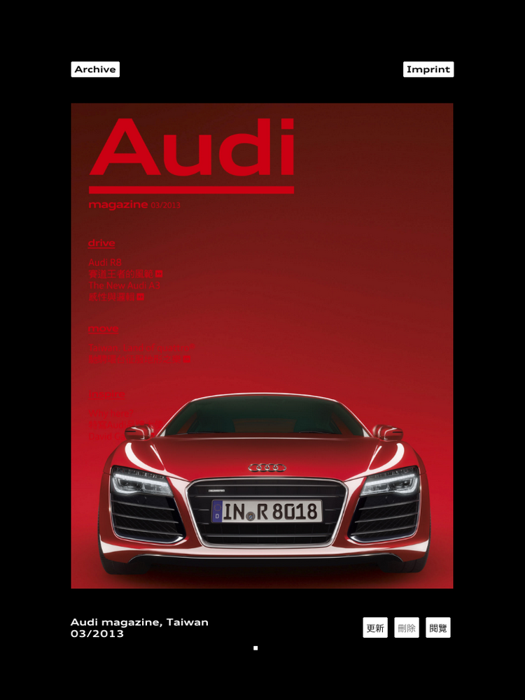 ![]() 而為滿足廣大Audi車迷們在瞬息萬變的數位時代中,能夠隨時掌握最新產品訊息以及四環品牌動態的渴望,台灣奧迪汽車特別針對品牌旗下所屬備受車主好評的Audi Magazine車主專屬季刊,推出眾多國內汽車品牌專屬刊物的創舉—全新「Audi Magazine iPad中文版」,同時宣佈創刊號已於10月15日在Apple Store正式上線,此舉象徵著四環品牌不僅領導汽車科技的研發方向,更將帶領Audi車主們體驗最先進的閱讀潮流趨勢,而Audi Magazine品牌專屬季刊不僅於傳播普及率將全面拓展至更多喜愛Audi品牌的消費者們,更象徵汽車品牌專屬刊物正式邁向數位進化的新里程碑!