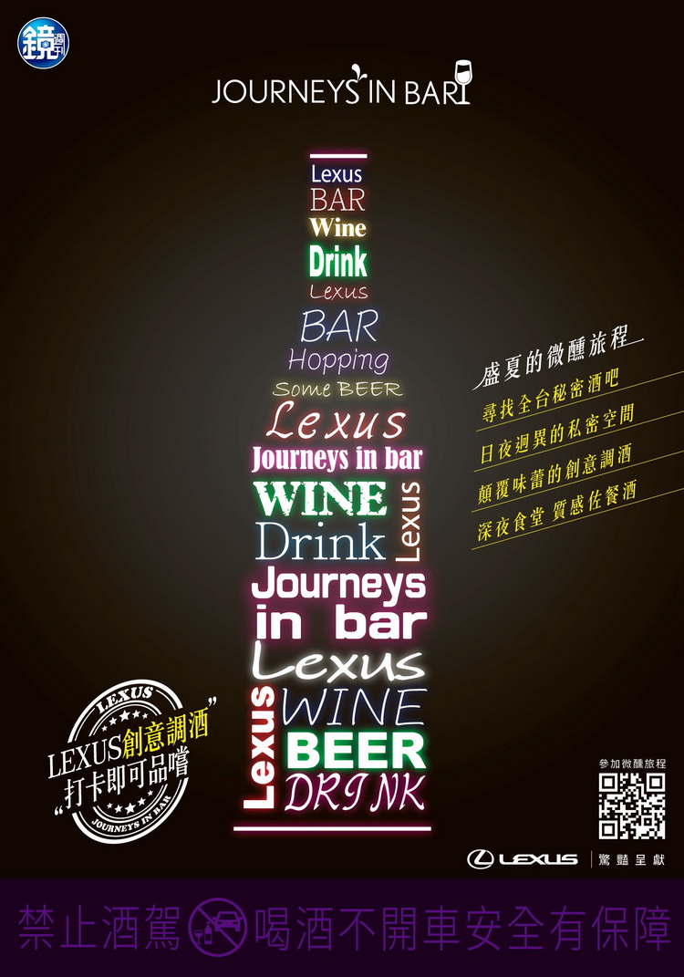 ![]() LEXUS JOURNEYS IN BAR活動,精選北、中、南共15間特色酒吧,邀您進入這場盛夏的微醺旅程,尋找全台秘密酒吧,包含風行於美國禁酒令時代,看不見入口的地下酒吧、內外風格迥異的Speakeasy Bar、可俯瞰城市日夜美景的露天高空酒吧等;酒吧更推出顛覆味蕾的多樣酒款,除了調酒師珍藏的日本珍稀級威士忌、清酒外,也可啜飲清爽甘甜的精釀啤酒,以及中西合璧的特色茶酒,讓賓客享受味覺的無限驚喜。本次精選酒吧,邀請調酒及烹飪領域的職人,從亞洲50大酒吧TCRC的調酒師,到米其林餐廳主廚,將會帶給貴賓頂級的餐酒饗宴。