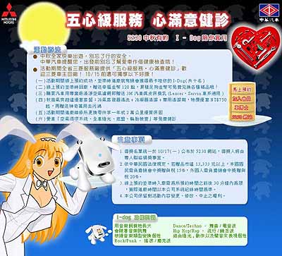 活動期間上中華三菱網站預約並準時進廠即贈送幸福金幣,可累計兌換多項免費原廠精品,還有機會抽中最卡娃伊SEGA i-Dog電子寵物(共十名)。