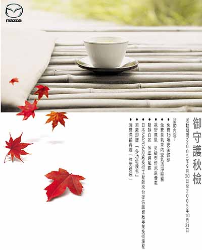 隨著初秋怡人的氣候到來,伴隨著寶島各地的美景,也正是全家出遊的好時機。MAZDA Taiwan提醒車主們,在季節轉換時分,為讓愛車各項機件功能調適在巔峰狀態,同時在秋季提早入夜的時刻確保車燈照明功能完備,以保行車安全,MAZDA Taiwan將從94年9月20日起至10月31日止,舉行「MAZDA御守護秋檢」活動,邀請車主回廠免費享受15項安全系統檢查,並提供免費臭氧車內空氣清淨服務、煞車通風碟以及讓車主視野無限寬廣的原廠昇級型燈泡組優惠。
