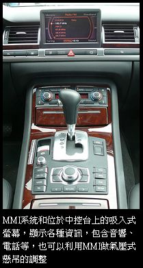 A8L儀錶板的判讀界面十分人性化,除了時速錶外,位於儀錶板中央螢幕會顯示時速及車輛狀況來提醒駕駛人注意,同時最上方也會顯示目前撥放的音樂,讓駕駛人不用分心去注意一旁的MMI螢幕。方向盤上的音量控制鍵和模式選擇健,使用上相當方便。大型豪華房車所必備的倒車顯影功能,在A8L上當然也是不可或缺的配備。實際測試的結果,除了顯影之外還有倒車路線預測功能,藉著方向盤轉動,預測路線便會顯示於螢幕上,只可惜MMI非中文介面。看來MMI要上手,還得先把英文練好。