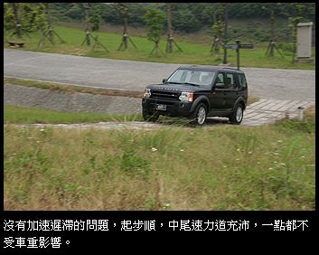 但是Discovery 3 TDV6還是有美中不足的地方,過軟的氣壓式懸吊令我相當訝異,一度以為是設定錯誤,但據隨車廠方人員說,Discovery 3 TDV6為了讓後座在長途乘坐更為舒適,因此懸吊方面有重新設定過,但是我認為這樣的設定有點太過頭,在彎中可以明顯感到側傾,在平路遇道坑洞也有如行船般的搖動。停紅燈時也出現點頭的狀況,以ㄧ台兩頓半的車身如此點頭的表現實在有點恐怖。
