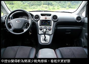 簡潔重實用的車室佈局上代Carens駕駛介面給人印象最深刻的,就是那頗有科技感的盾形中控台。這一代則一反前規改走圓滑柔和的風格,與外觀相互呼應。排檔由原來方向機柱上改為中控台上的高置式,換檔操作便利些,但也犧牲了前座中央的空間,好壞見仁見智;三連儀錶板簡單易讀,但儀錶底色淺,有時會影響到辨識性。中控台造型看起來簡單舒適,很符合Carens輕鬆旅遊的產品調性(上一代的盾形中控台就很令人與國產Lancer聯想在一起)。 Carens的七人座椅當然也沒少掉折疊變化的功能,60:40分離第二排座椅在先將座墊前翻之後即可折疊打平,50:50分離的第三排座椅椅背則可直接打平,不過後排椅背折疊時都需先將頭枕拆下,全平後的後方車室在二、三排間有一段小空隙,所以如果是人想要躺上去的話就得留意一下。