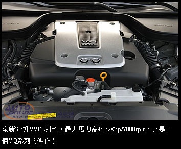 增加衝程變成3.7升並增加VVEL系統全新改款的G37 Coupe最大的改變莫過於引擎排氣量從3.5升的VQ35HR系列擴大到3.7升,維持原本95.5mm的缸徑,加大曲軸的旋轉半徑使衝程從81.4mm增加到86mm,排氣量增加為3696cc,並且把壓縮比從10.6提高到11.0。不僅如此,還加入了最新研發的VVEL可變氣門正時及電子控制氣門揚程系統,成為代號VQ37VHR的最新世代高性能引擎。這具由VQ35HR引擎修正35%組件進化而來的VQ37VHR,可發揮328hp/7000rpm的最大馬力以及37kgm/5000rpm的最大扭力,原廠宣稱比PORSCHE 911 Carrera的325hp更具威力,也顯示出挑戰者的企圖心。