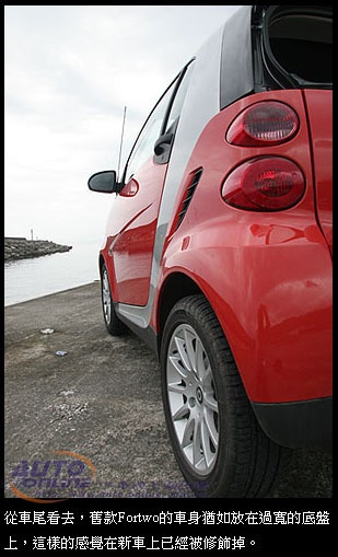 從上一代開始Fortwo的操控就有大型GO KART之稱,其實這裡指的並不是說它是操控取向,只是一個男人不捨、女人最愛的特性:「硬到不行!」或許應該說硬到會跳比較適合:壓到坑洞,車上的手機可以跟著跳到重新開機!但其實如果能夠好好利用這樣的設定配合重心轉移,有時也能很有趣;過去筆者窮極無聊時就會開著舊款Fortwo Carbiolet沿日月潭環潭公路繞行“夜巡”,其中德化社至頭社的中低速路段平均車速竟可與駕駛Impreza GT時所差無幾,由此可見一斑。新的Fortwo在懸吊舒適性上並沒有改進多少,懸吊設計在抑制較大震動時幾乎可用無能為力形容,車上乘員和輪胎同時知道壓上石頭,一般人會對這樣的水準肯定感到不滿,而熟悉前一代車的人則會直覺:「聲音好像比較好聽了?!」
