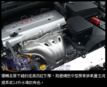 動力升級的平衡感![]() 借自Previa原廠代號2AZ-FE的2.4升直列四缸VVT-i引擎,排氣量為2,362cc,與2.0升享有相同的稅制等級,同樣使用VVT-i連續可變汽門正時控制系統的技術,在能源局網站上公佈的平均油耗為11.9km/L,稍遜2.0E的12.3km/L,其實並不算是太出色。帳面數據上,最大馬力167ps/6000rpm、最大扭力22.9kgm/4000rpm,比2.0升多出20ps與3.5kgm的動力,則是相當合理的數據,不過真正讓人關心的還是實際上路造成的影響。