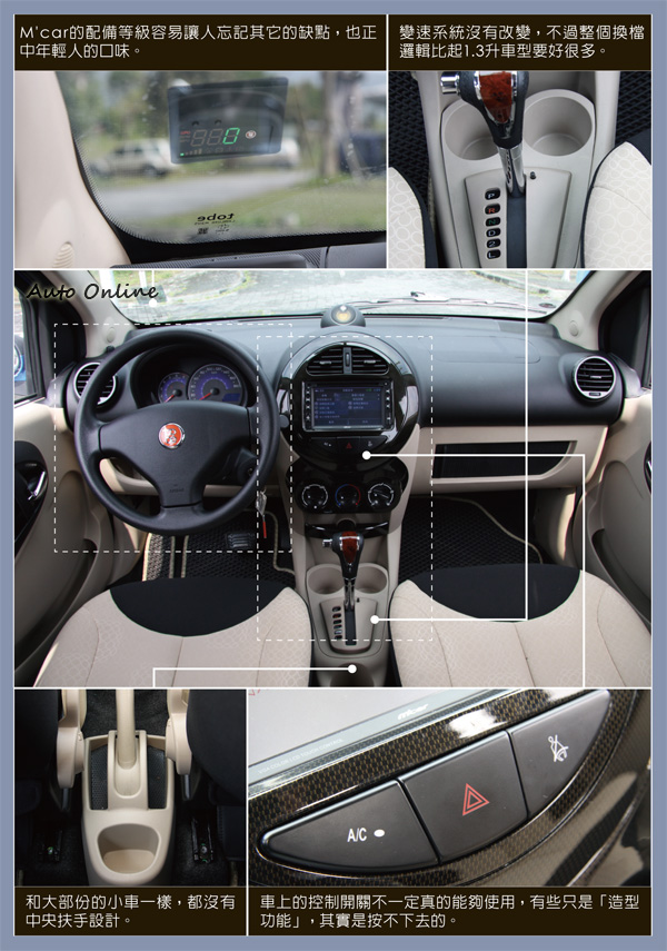 從原始資料看來,排氣量增加的方式是透過拉長汽缸行程,至於缸徑則維持不變,壓縮比提高之後,功率輸出也跟著變大。嚴格講起來,若配備相同,引擎的換裝對於成本影響應該不大,甚至售價可以不需更動。不過實際上,在M'car產品陣線重新調整過後,1.3升目前只保留最陽春的入門手排與自排車型接單生產,整個車系重心已轉移到1.5升,並且除了原本的輕鬆版/樂活版/影音版之外,又新增了最頂級的「iMove版」,繼續強化M'car的配備吸引力。