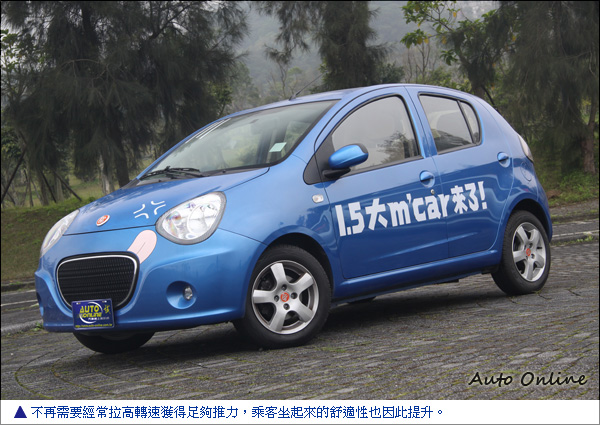 排氣量的增加自然會伴隨更理想的動力表現,而從理論上來看,如今擁有更長的汽缸行程,也不再需要拉高轉速來榨取扭力,它的動力數據也證實了這一點;同樣在6000rpm的時候,現在最大馬力由原本的86hp提升至93hp,而最大扭力則有戲劇化的轉變,由11.2kgm/5200rpm變為13.1kgm/3400rpm, 這樣的動力水準雖然比其他同排氣量車型低許多,不過注意它在三千多轉就能達到最大扭力,意思是要超車爬坡也就比較不需要老是踩死油門了,可想而知對於油耗也會有幫助。能源局的資料顯示,以美國FTP75指令測試,自排M'car 1.3的平均油耗為14.0km/L,M'car 1.5為14.2km/L,實際上路後的油耗不太可能這麼好,不過與舊款經驗相比,新款引擎應該會好很多。