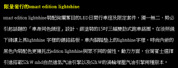 52kW汽油引擎mhd是一顆一公升3汽缸自然進氣引擎,最大馬力為71hp及9.3kg-m最大扭力,最高速為145km,0-100km加速13.7秒。寫這些數據只是讓讀者知道它的能耐,畢竟強調在市區實用性並不會在乎它有什麼強大的性能表現。試駕過程中,包含市區道路跟一小段山路,Smart fortwo在市區走走停停路況下加速反應輕快,自手排五速變速箱不要對它有過多期待,換檔時間慢跟頓挫感嚴重,如果把DSG自手排變速箱比喻成車手換檔,那Smart這顆變速箱應該只是初學者剛開手排車的換檔感覺。