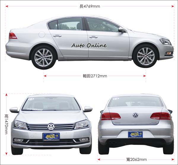 與前一代相比,New Passat雖然在車身尺碼上沒有太大變化,四門房車車身的長、寬、高分別為4769mm×1820mm×1474mm,軸距則為2712mm,但拜造型之賜,New Passat予人相當動感且更具大型房車的氣勢!