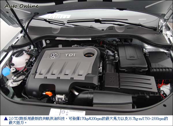 2.0 TDI則採用最新的共軌供油科技,可發揮170hp/4200rpm的最大馬力以及35.7kg-m/1750~2500rpm的最大扭力。可協助達到223km/H的安全極速與8.6秒的0~100km/H加速成績。同時導入引擎自動啟閉與煞車動能回收復的BlueMotion Technolog全新節能科技以及智慧型駕駛輔助系統,使得New Passat可獲得18.9km/L的平均油耗表現。