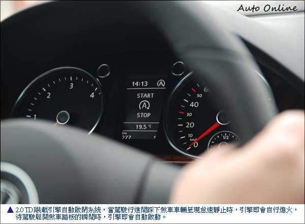 引擎自動啟閉系統目前僅搭載在2.0 TDI上,當駕駛踩下煞車車輛呈現怠速靜止時,New Passat 2.0 TDI引擎即會自行熄火,此時車輛各項電器設備維持正常運作,而空調系統僅保留送風功能;待駕駛鬆開煞車踏板的瞬間時,引擎即會自動啟動。此系統可減少車輛在都會區中走走停停時的CO²排放,並進一步達到降低油耗的效果。