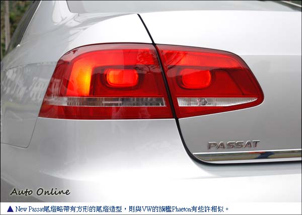 New Passat全車系都配有日間行車燈,與許多車輛日間行車燈不同的是New Passat的日間行燈與霧燈並列在前保桿下緣兩側,且為一般的鎢絲燈具,當開啟小燈後日間行車燈隨即熄滅。另外,New Passat尾燈略帶有方形的尾燈造型,則與VW的旗艦Phaeton相似。