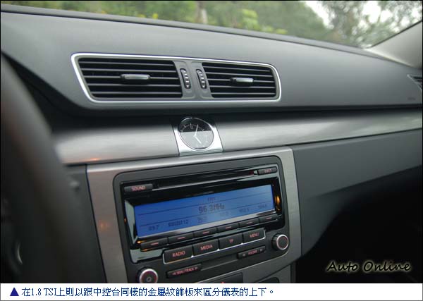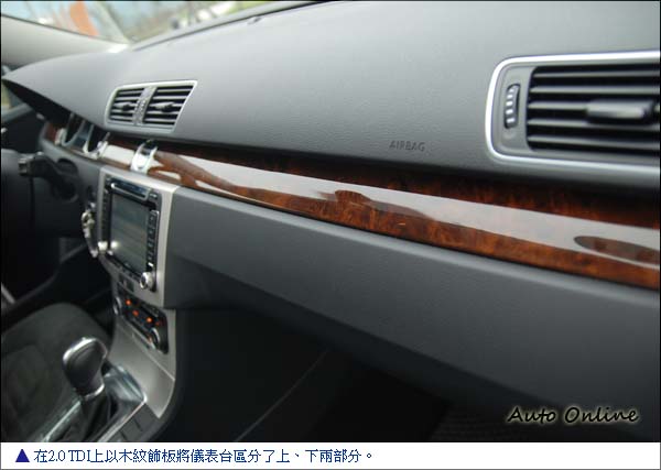 在內裝上,簡潔俐落的儀表台,極為搭配New Passat的犀利外觀。基本上New Passat的儀表台以暗灰色為主要色調,在2.0 TDI上以木紋飾板將儀表台區分了上、下兩部分,而1.8 TSI則以跟中控台同樣的金屬紋飾板來區分。然而這木紋或金屬紋飾板,也同時向兩側車門延伸,營造車室相同的氛圍。