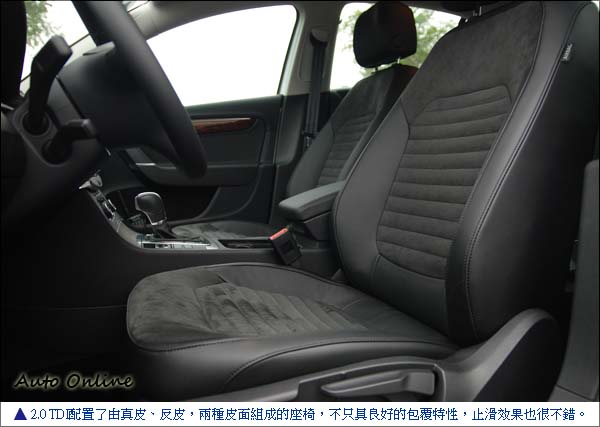 除了木紋與金屬紋的不同外,2.0 TDI與1.8 TSI的不同,還可從座椅上看得出。2.0 TDI配置了由真皮、反皮,兩種皮面組成的座椅;而1.8 TSI則配置織布的座椅。雖然材質有所不同,不過卻都具良好的包覆特性,只不過2.0 TDI座椅較具止滑特性罷了。