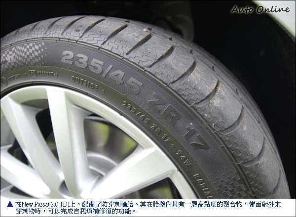 而在New Passat 2.0 TDI上,還配備了防穿刺輪胎。防穿刺輪胎在胎壁內具有一層高黏度的聚合物,當面對外來穿刺物時,可以完成自我填補修復的功能,並有效的填補5mm直徑以下之的穿刺孔洞。即使外來穿刺物移除後,輪胎也無一般輪胎遭刺穿後的洩氣狀況,且仍可保持在胎壓飽滿狀態。而駕駛還可以從胎壓顯示器中,得知輪胎胎壓狀態,瞭解輪胎可否繼續行駛。