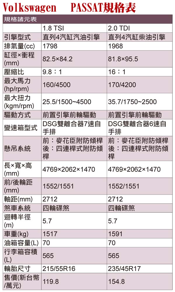 而New Passat 2.0 TDI的表現亦相當出色,起步時渾厚的扭力加速感,像是有致命吸引力的使人上癮。兩款車的懸吊表現幾乎沒有差別,硬朗中保持帶點舒適的Q度,唯一會讓你有感覺到差異的,就只有輪胎尺碼不同所反應不同的回饋手感而已,若不細分其實兩者是不太感覺到有何不同的。