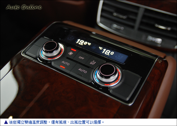 實際在高速公路100km巡航轉速1600rpm,換得的油耗表現可想而知。在D檔巡航時電腦會盡量提早入檔,可以維持最高速度最低轉速避免產生不必要的油耗;但如果把檔位排入S檔模式,變速箱性情馬上大變,變速箱會延後換檔、油門反應變敏感,油門只要多踩一點變速箱會降檔換取更高的加速反應。特殊的排檔設計需要花點時間來適應,因為不像傳統檔位是一格一格設計,AUDI A8排檔桿永遠維持在中間位置,往後大力一點直接可以從P檔排入D檔,輕一點則排入R檔,拿捏好力道可以排入N檔。