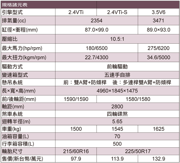 由於記者參加的是HONDA所舉辦的公辦試駕活動,現場三款車型從入門的2.4VTi、2.4VTi-S到3.5 V6都有。在官方以編輯長相決定車型的前提之下我們則是被分到頂級的3.5 V6版本。