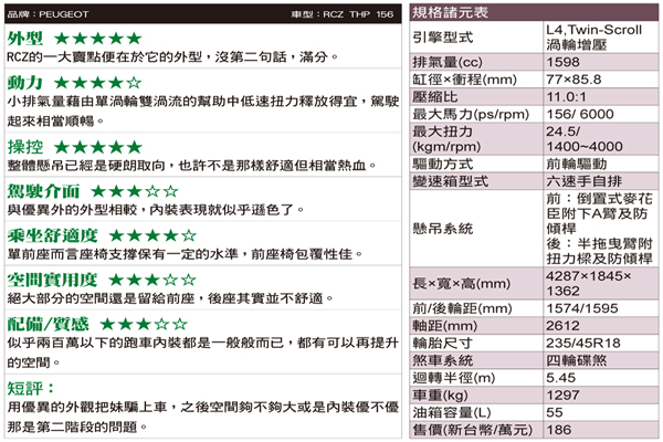 自排的RCZ是一台好上手但又充滿許多駕馭樂趣的一台小跑車。開它上街購物,實用。讓它馳騁在山林彎道間,痛快!有人說買186萬的RCZ不如買AUDI的TT,但實際試駕過後也許一切答案都將會有所不同。
