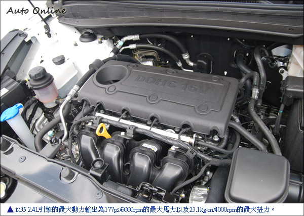 HYUNDAI ix35 2.4L 4WD即是前言所說競爭力大幅提升的車款,首先其引擎排氣量從原先的2.0L提升至2.4L,並以全新的新式平衡軸模組設計,降低引擎運轉時的共振,提供車室乘員更加平穩的駕駛感受。