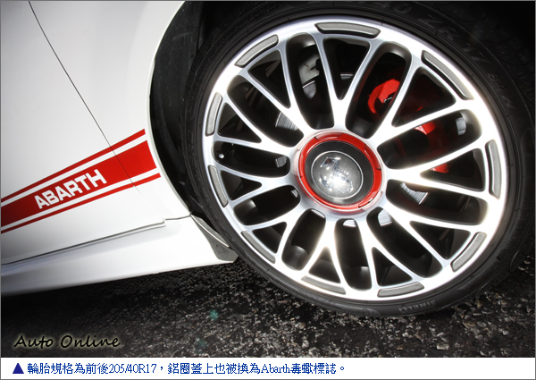 這顆1.4升的16V T-Jet引擎實力其實不只如此,同樣引擎在Grande Punto Abarth上卻可以壓榨出150hp的實力,2008年法蘭克福車展上Grande Punto Abarth SS相同引擎經過技術團隊修改創造出180hp馬力的驚人之舉,所以在500 Abarth上調教算是保守。操控對於這類短軸距的小鋼砲非常重要,懸吊經過Abarth專業團隊設計調教後,給予500 Abarth一組運動懸吊,搭配前後205/40R17輪胎尺寸,極短的軸距加上運動懸吊開起來有如卡丁車的駕駛感覺,處理任何彎道都綽綽有餘。
