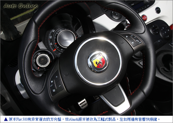 當你坐進FIAT 500的駕駛座其實你不會想要認真的去激烈操駕它,但如果坐進 500 Abarth那可就不一樣。大圓設計的時速錶以及轉速錶,中間有圓形行車旅行電腦,在居中的大圓儀錶左方有顆小儀錶顯示增壓值以及超轉燈。中控台上有圓形音響、冷氣控制按鍵、圓形冷氣出風口,舉目看到的元素都是圓形,跟外觀相互輝映。內裝用料及質感都屬高水準,同車身烤漆的中控台、不織布材質的賽車座椅跟門飾板,但車內空間有點狹小,左右空間不足加上成人無法坐的後座,讓人無法忘記它還是一台軸距只有2300mm的小車。
