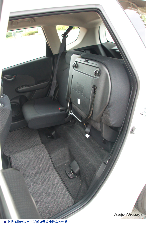 一般小車可能因為行李廂地板到車頂的高度不夠而不好擺放。但在Fit只要將後座椅墊整個掀起固定,就可以利用達1280mm的上下高度擺放物品。還有一種玩法就是前座椅向翻,但後座椅背不用打平,停車休息時就可以直接當做大躺椅來坐囉。