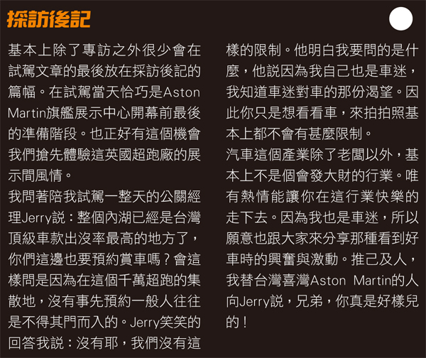 每次看到身價不斐的跑車經過我身邊,我心裡都在猜測下車的人究竟是什麼扮相。但我總幻想從Aston Martin下車的人應該是個高大挺拔身著合身西裝的帥哥才是。不諱言的我應該也是受到007電影的影響,但有機會試過不少跑車的我必須說Aston Martin始終是我的最愛。