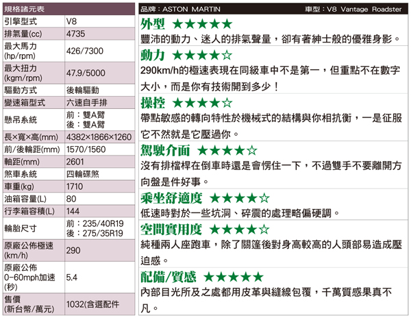 從引擎室裡的鋁合金拉桿、可以降低重心有效潤滑的乾式油底殼、鋁合金VH底盤與前後雙A臂的懸吊設定來看,你可以感受到Aston Martin致力最追求更好更優越的操控性。但我們也必須坦言V8 Vantage Roadster在定位上終究不是以極端激烈駕駛為主。與同公司的其他車系相較,它所呈現的調性會稍稍柔和一些。但如同在建中資優班考第五名一樣,在班上不見得特別出色,但走教室門口後依舊可以電翻一大票人。